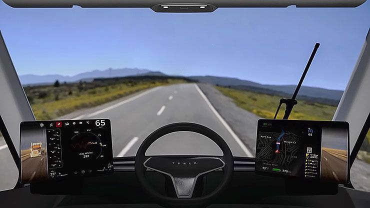 Look inside the cab of the Semi, and there’s no doubt Tesla knows how to design a vehicle. The driver’s seat is now in the middle of the cab. Because it didn’t need to build around a bulky diesel engine, Tesla made the nose of the cab a vertical slab, and the main seat is so far forward, you can see the ground just in front of the vehicle. The human in charge gets two 15-inch touchscreens, one on either side, to handle navigation, data logging, and blind spot monitoring.