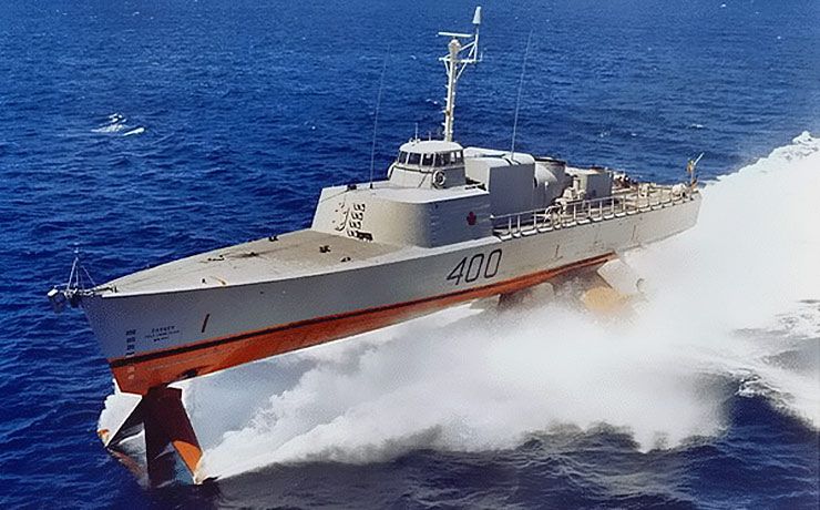 The HMCS Bras d’Or 400 is the world’s fastest warship…During sea trials in 1969 this experimental Canadian Hydrofoil reached speeds of 72 Mph (63 Knots).  Foilborne power was provided by a FT4A-2 gas turbine developing 25,500 horsepower at 21,500 rpm through General Electric gearboxes to a pair of three-bladed supercavitating propellers.