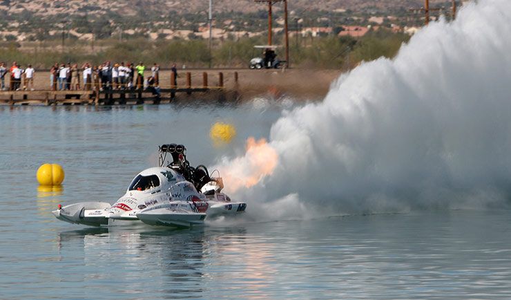 The official speed record requires a boat to run a full kilometer twice, once in each direction, within one hour according to the U.I.M. (whatever that stands for). Drag boats can’t do that. Even if they could, Ken Warby was clocked at 345mph at the end of one run. The average speed of both runs is used to determine his average speed of 317.6mph.