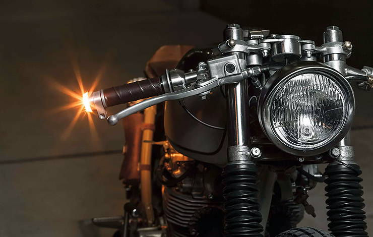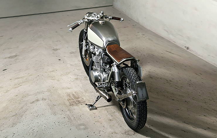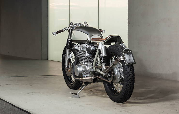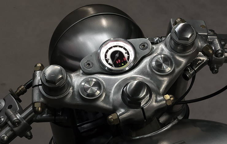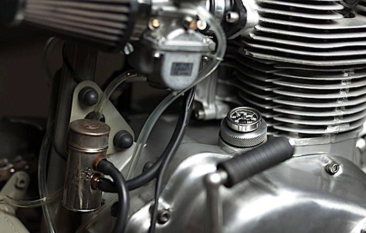Overall it’s an attractive and minimalist recipe, but it’s the odd touches that set it apart. For instance, the Honda twin draws its oil from a vintage Colgate shaving cup. Brilliant.