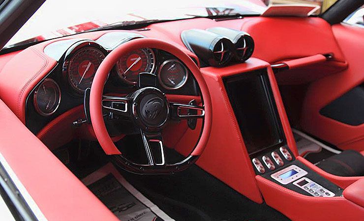 The interior is pretty wild as well. The dashboard and center console are completely made by hand, first built of sheet metal and then molded in carbon fiber. There is an iPad in the vertical orientation (like the screen in a Tesla Model S) in the center of the dash, featuring a GPS and full audio controls.